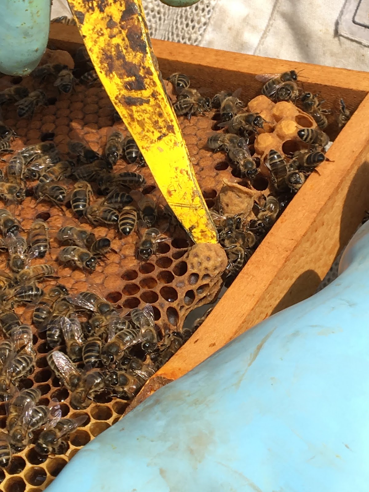 Comme d'habitude, on enlève les amusettes pour éviter la naissance de nouvelles reines. On observe aussi beaucoup de cellules de mâles.